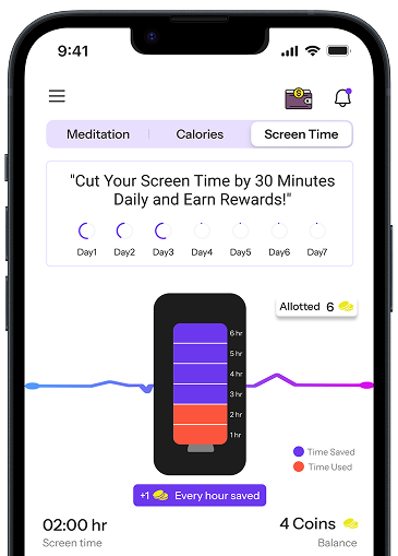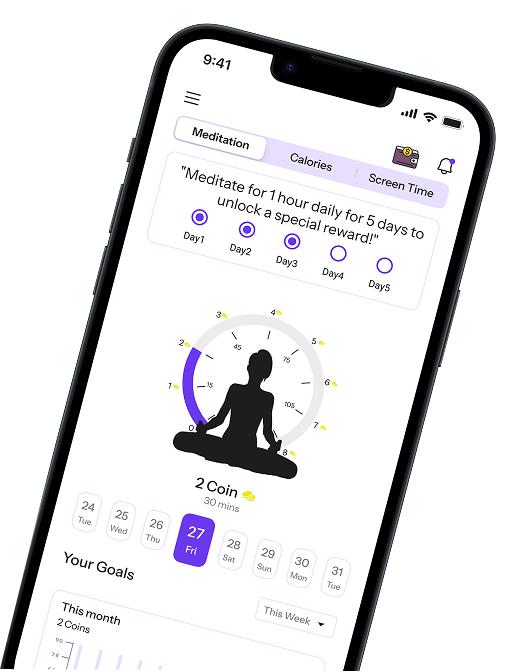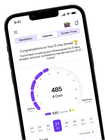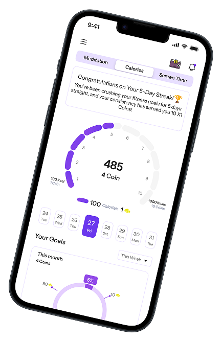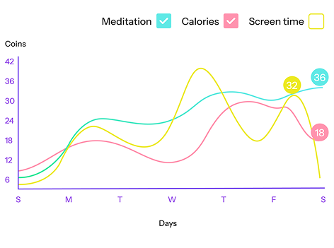 Earn X1 Coins for burning calories, meditating, and reducing screen time.